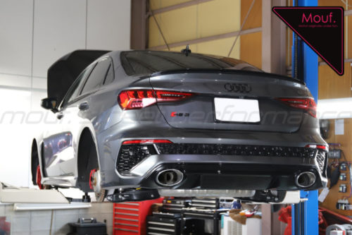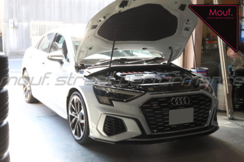 作業ですが、遠方からお越しのAUDI RS3さんのブレーキパッド、タイヤ交換をおこないました